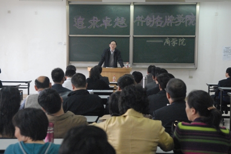 譚校長(zhǎng)在講話中強(qiáng)調(diào),科學(xué)發(fā)展是學(xué)校的必由之路,學(xué)校科學(xué)發(fā)展的總體工作思路就是學(xué)科優(yōu)勢(shì)更加突出,人才培養(yǎng)更加規(guī)范,科研實(shí)力更加雄厚,校園環(huán)境更加文明。商學(xué)院要緊緊圍繞這個(gè)總體思路規(guī)劃未來的發(fā)展,首先要抓好學(xué)科建設(shè),一個(gè)學(xué)院要在競(jìng)爭(zhēng)中立足必須突出自己的優(yōu)勢(shì)學(xué)科,在優(yōu)勢(shì)學(xué)科的建設(shè)中,人財(cái)物要給予相應(yīng)的傾斜,每個(gè)老師要根據(jù)學(xué)院學(xué)科建設(shè)規(guī)劃,找到自己的定位,明確自己的方向;其次要加強(qiáng)師資隊(duì)伍建設(shè),商學(xué)院現(xiàn)在的師資力量還沒有達(dá)到理想的水平,必須在優(yōu)化師資結(jié)構(gòu),提高師資水平上下功夫,要鼓勵(lì)教師在科研上追求“更高、更快、更強(qiáng)”;三要加強(qiáng)條件建設(shè),商學(xué)院要把商學(xué)院大樓環(huán)境建設(shè)好,利用率一定要高,環(huán)境一定要令人感覺很舒服,總體效果一定要達(dá)到國(guó)際一般水平。