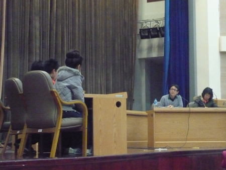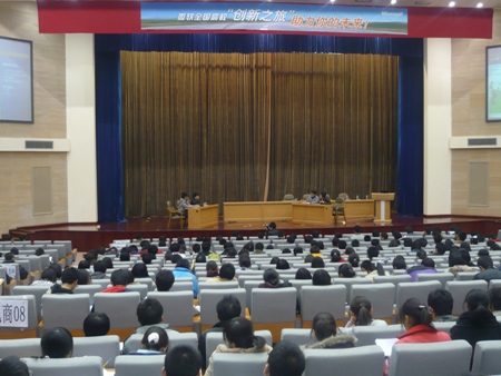 主講人張萌與劉益磊先后向同學們介紹了微軟的內部人員概況、微軟的新一代產品windows7,以及微軟在全國高校進行校園招聘的流程。