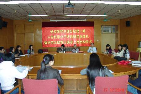 近日,研究生部在阜成路校區舉行研究生助管志愿者工作啟動儀式。研究生部黨總支書記董竹娟、副書記熊慧參加會議。共有25名黨校畢業學員和26名首次上崗的研究生助管志愿者到會。