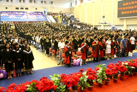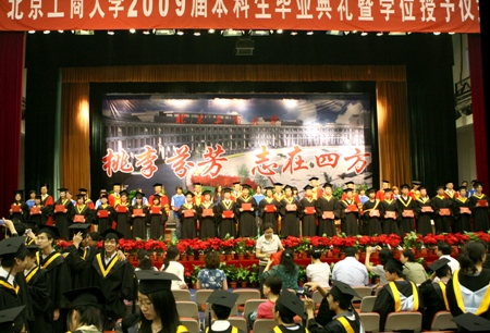6月18日,良鄉(xiāng)校區(qū)體育館內(nèi)氣氛格外熱烈,北京工商大學(xué)2009屆本科生畢業(yè)典禮暨學(xué)位授予儀式在這里隆重舉行。參加典禮的有身著校長服校領(lǐng)導(dǎo)孫堯東、譚向勇、張德玉、孫寶國、謝志華、李朝鮮、王尚忠、張耘和各學(xué)院負(fù)責(zé)人,以及本科生導(dǎo)師代表、全體2009屆本科生和畢業(yè)生親屬3000余人。畢業(yè)典禮由校黨委盧思鋒副書記主持。
