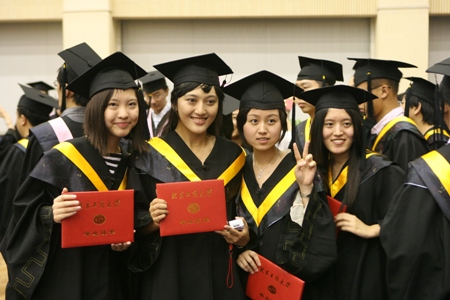 即使在金融危機的陰霾下,但是更多的同學都很樂觀和輕松的,同時也對自己的未來充滿信心。經濟05的喬同學拿著一把羽毛扇子,悠然自得的樣還頗有諸葛臥龍的神韻,他告訴記者:“為什么拿著一個羽扇呢?這是因為學校給了我智慧和知識,即使天空陰暗,我們的內心也充滿了陽光,充滿了自信。”信管052班的王松是我校兩屆學生會主席。他找工作也曾碰過壁,經過努力,最后成功簽約首鋼。“努力就會有回報”,畢業典禮了他將這句話送給學弟學妹們。王松是我校向社會輸送的優秀學子之一,他也給大家講著一個道理,無論在什么樣的就業環境之下,只要是優秀的,沒有找不到工作的。