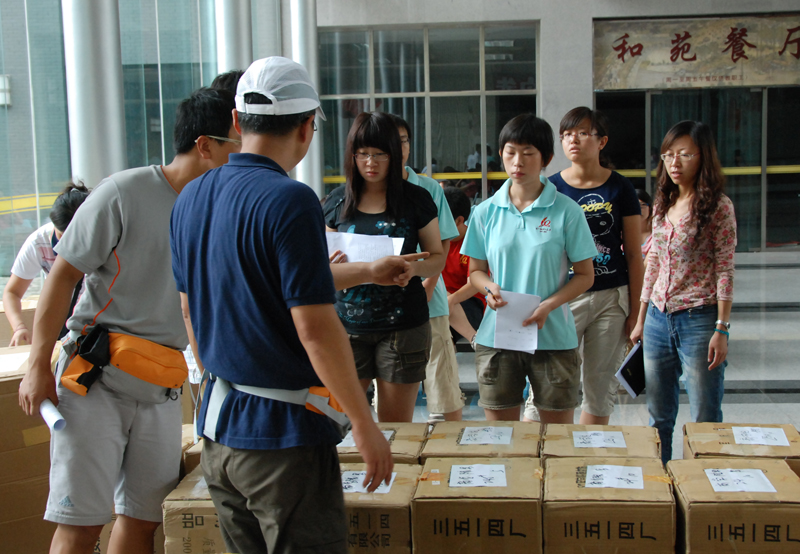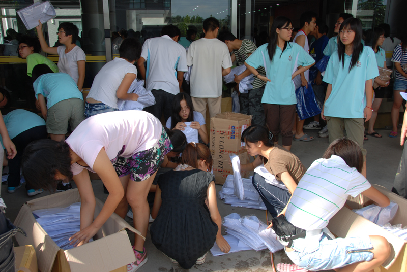 下午1點(diǎn)多,服裝運(yùn)抵我校良鄉(xiāng)校區(qū)。團(tuán)委以及各學(xué)院負(fù)責(zé)老師親臨現(xiàn)場(chǎng),組織搬運(yùn)和發(fā)放工作。搬運(yùn)工作剛進(jìn)行就下起小雨,但在場(chǎng)的老師和同學(xué)都堅(jiān)持在雨中奮戰(zhàn),以最快速度將所有服裝都搬運(yùn)到學(xué)生活動(dòng)中心一層。隨即,各學(xué)院負(fù)責(zé)老師及中、小隊(duì)長(zhǎng)按照名單對(duì)各自學(xué)院服裝進(jìn)行核查。經(jīng)過兩個(gè)多小時(shí)的仔細(xì)復(fù)雜的核對(duì)后,各學(xué)院將服裝按照姓名統(tǒng)一捆綁成套,以便學(xué)生領(lǐng)取。下午3點(diǎn)半,發(fā)放工作正式開始。校志協(xié)以及校團(tuán)委的志愿者也協(xié)助各學(xué)院進(jìn)行發(fā)放。