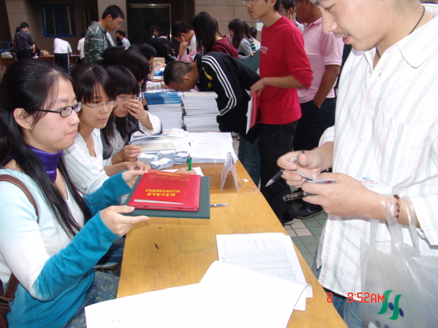 為了做好迎接09級新生的志愿服務工作,研究生學會在黨總支副書記熊慧老師的指導下,于一個星期前就開始部署提前準備為新生提供全面而細致的服務。將《報到流程》、《報到須知》、《新生入學安排》都噴印好使學生一目了然。和往年不同的是,今年簽到窗口由一個改為三個,新生按照學院選擇報到窗口,這大大加快了簽到的速度。