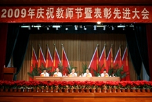 歲月如歌,時光如昨,第25個教師節即將到來。9月9日下午,學校在阜成路東區禮堂隆重召開2009年慶祝教師節暨表彰先進大會,校領導孫堯東、譚向勇、盧思鋒、李朝鮮、王尚忠及教職工代表、全體中層干部、系主任、學生代表參加了會議。大會由黨委副書記盧思鋒主持。