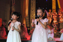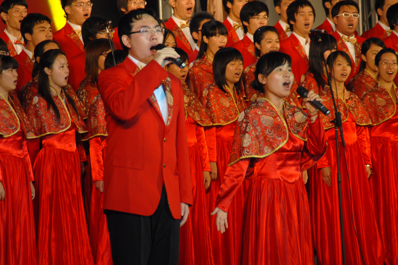 此次演出在我校學生合唱團的一曲《紅旗頌》中拉開了帷幕。同學們身著華麗的紅色晚禮服,個個神采奕奕,伴隨著激昂的歌聲,一張張笑臉綻放在絢麗的燈光下,同學飽含深情地誦出了對祖國母親的一片赤子之心,感人至深。作為領唱的韓添和張一帆同學則帶領大家用美妙的歌喉表達對祖國的祝福。場下觀眾跟隨樂曲一齊揮動著手中的國旗,氣氛熱烈。張一帆在演出結束后告訴記者“正值祖國60年華誕之際,大家歡聚一堂,機會難得,我們與祖國共奮進,我們為祖國獻歌喉!”