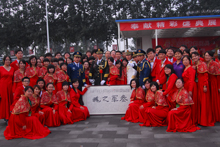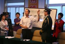按照42方陣的安排,盧書記代表我校向解放軍聯合軍樂團贈送了一份意味深長的禮物,"三軍之魂"書法作品,上提"掁國威揚軍威,贊我人民解放軍聯合軍樂團光榮執行國慶60周年閱兵群眾游行演奏任務",上有我校2300名參加國慶閱兵游行晚會的師生簽名和祝愿,這件富有創意的禮品受到軍樂團官兵的熱烈歡迎,他們紛紛前來與我校師生合影留念,互贈禮物。