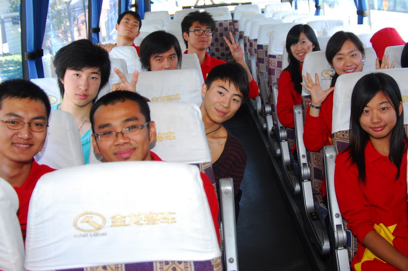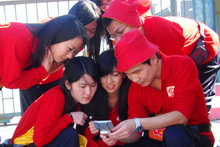 舞蹈隊的出發時間定在11點半,而這正式我校首都國慶群眾游行“艱苦創業”方隊經過天安門的時間,同學們在集合區急切地想知道我校游行方陣的情況,情急之下,同學們拿出手機,通過網絡電視觀看群眾游行方隊的盛況。在看到我校的學生簇擁著花車走過天安門廣場時,大家不禁發出了陣陣歡呼。“太激動了!”舞蹈隊的孫奇同學說道:“看著他們從天安門前走過,手舉花環,感覺身體里熱血在沸騰!”舞蹈隊的崇小萌同學十分地興奮,“看到了他們的出色表現,我也下定決心,要將自己最美麗的一面在天安門前展現!”澎湖同學也表示:“我們平時訓練很緊張,在上周日剛剛增加了很多節目,都是這幾天趕練完的,今天一定不會出錯!”