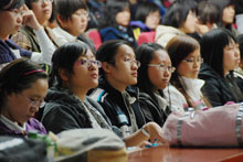 朱衛(wèi)國(guó)以一個(gè)志愿者團(tuán)隊(duì)支教的視頻短片引出了今天講座的主題——“傳承志愿文化,服務(wù)和諧社會(huì)”。他就其自身經(jīng)歷與個(gè)人感受,逐一對(duì)志愿者的實(shí)質(zhì),志愿服務(wù)在中西方的發(fā)展,志愿服務(wù)的特征、基本要素,志愿者的原則、權(quán)利、義務(wù)等同學(xué)們平日了解較少的知識(shí)進(jìn)行了講解。