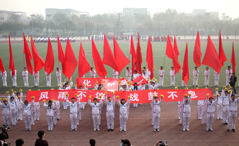 由60名化工學(xué)院新生組成的方隊(duì)用鏗鏘的步伐向在場(chǎng)觀(guān)眾證明:他們是一個(gè)訓(xùn)練有素的團(tuán)隊(duì)。瞧:當(dāng)通過(guò)主席臺(tái)時(shí),他們迅速、有序地排出一個(gè)熠熠生輝的“工”字,鮮亮的條幅和震耳欲聾的口號(hào)帶來(lái)了阜成路校區(qū)師生的問(wèn)候。
