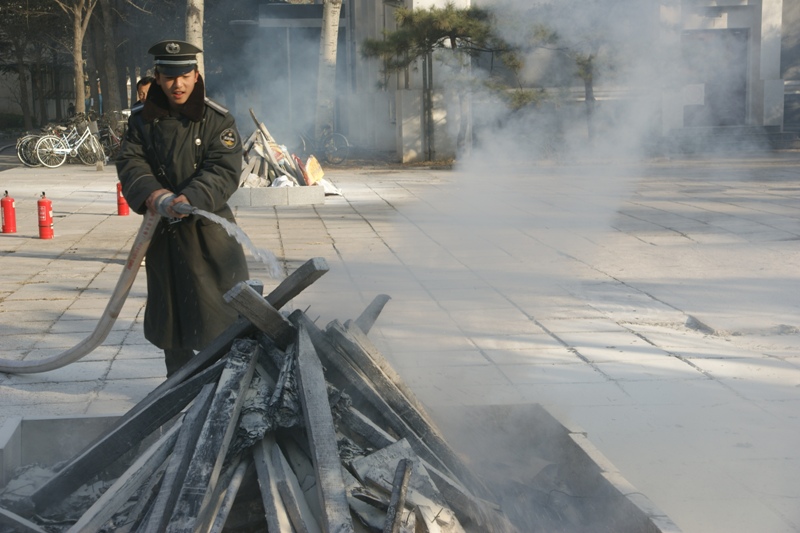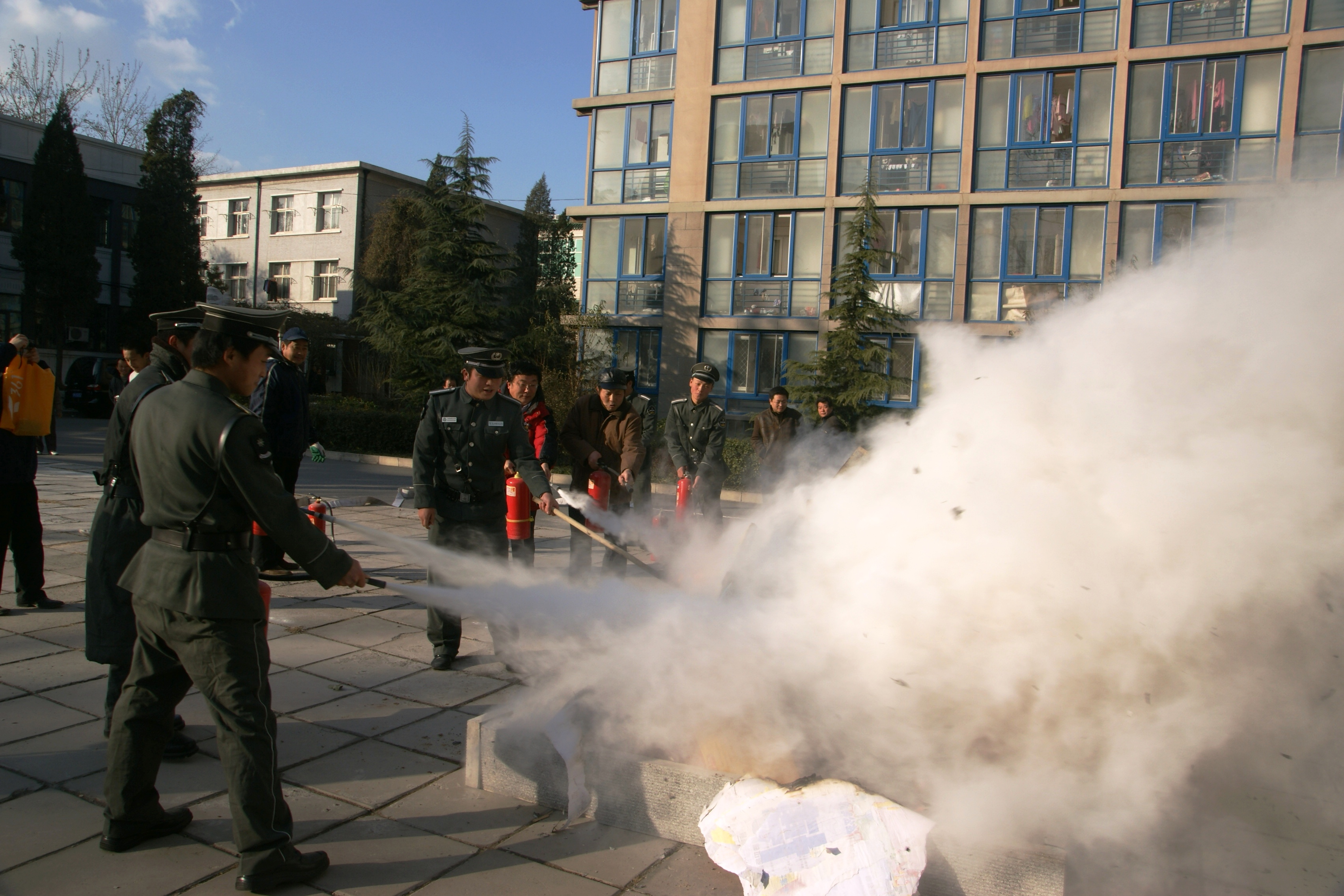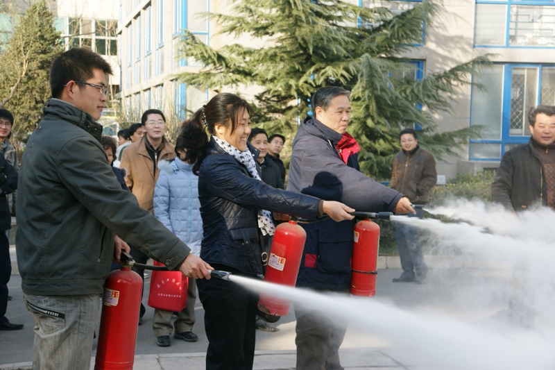 會后在東區(qū)學生公寓前,頓處長示范了干粉滅火器的使用方法,全體參訓教工很有興趣地進行了演練,掌握了滅火器的使用方法。接著在場保安又進行了水用消防栓、消防帶的使用演習。
