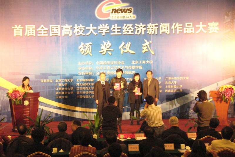 首屆全國大學生經濟新聞作品大賽及頒獎大會由我校與中國經濟報刊協會聯合主辦,我校藝術與傳媒學院新聞系負責承辦。本次大賽在今年1月開始籌備后,得到了學界、業界的大力支持,全國27家高校成為本次大賽的發起院校。大賽最終收到來自全國20余所高校的305篇參賽作品。經大賽評委會專家評定,來自北京工商大學、廣西大學、華中科技大學、江西師范大學、蘭州大學、上海財經大學、云南大學等10余所高校的20多位同學的27篇作品獲獎。重慶工商大學長江傳媒學院、江西師范大學傳播學院、河北經貿大學人文學院等7所高校的新聞院系獲得優秀組織獎。我校在本次大賽中取得了優異的成績,新聞學專業劉洋碩、胡楠等6位同學分別獲得專題類、消息類作品的一、二、三等獎。