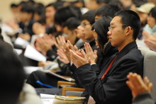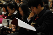 團(tuán)市委副書(shū)記沈千帆,團(tuán)市委大學(xué)部部長(zhǎng)胡九龍,北京市學(xué)聯(lián)執(zhí)行主席楊靜,校領(lǐng)導(dǎo)孫堯東、譚向勇、盧思鋒、張德玉、李朝鮮、張?jiān)偶皩W(xué)校各職能部門(mén)負(fù)責(zé)人出席大會(huì)并在主席臺(tái)就座。北京大學(xué)、清華大學(xué)、人民大學(xué)等50多所兄弟院校團(tuán)委和學(xué)生會(huì)負(fù)責(zé)人應(yīng)邀出席。學(xué)校各院系部黨政領(lǐng)導(dǎo)、輔導(dǎo)員、343名團(tuán)代會(huì)代表,313名學(xué)代會(huì)代表以及嘉華學(xué)院列席代表參加會(huì)議。校團(tuán)委副書(shū)記吳志鵬主持會(huì)議。