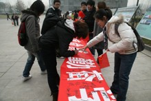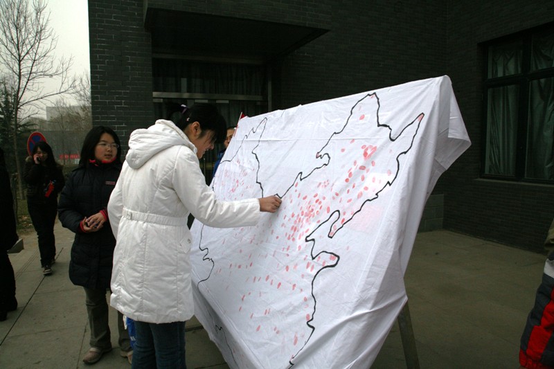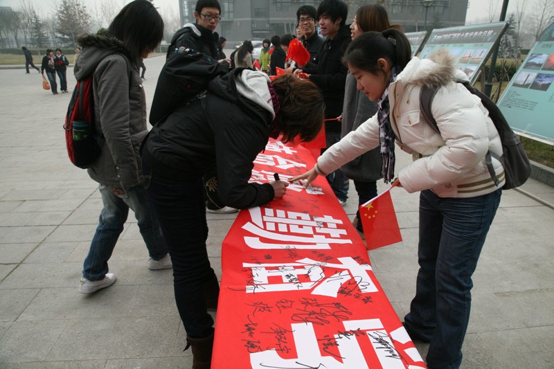 學(xué)生活動(dòng)中心前,內(nèi)容豐富的手繪展板帶大家重溫 “一二•九”運(yùn)動(dòng)的光榮歷史,一張印有祖國(guó)輪廓的白色錦布懸掛在大家面前,同學(xué)們用手蘸上中國(guó)紅對(duì)祖國(guó)版圖進(jìn)行填色,以表達(dá)對(duì)祖國(guó)熱愛(ài)之情。“紀(jì)念‘一二•九’運(yùn)動(dòng),弘揚(yáng)愛(ài)國(guó)主義精神,增強(qiáng)責(zé)任感和使命感,勤奮學(xué)習(xí),報(bào)效祖國(guó)”的條幅上,同學(xué)們積極踴躍地簽上自己的名字,寫(xiě)下對(duì)祖國(guó)的寄語(yǔ)。此外,活動(dòng)現(xiàn)場(chǎng)還進(jìn)行了關(guān)于“一二•九”運(yùn)動(dòng)的有獎(jiǎng)知識(shí)問(wèn)答。