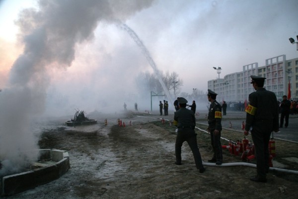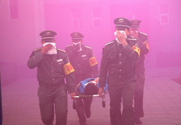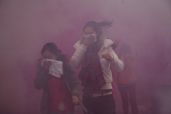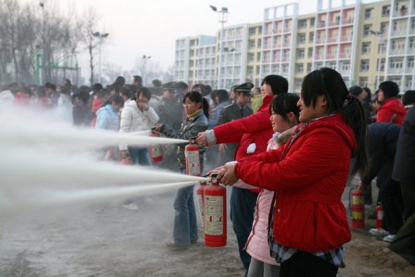 16:30警報(bào)長(zhǎng)鳴,煙霧滾滾,消防演習(xí)正式開始。2000多名新生以毛巾掩面,有秩序地從煙霧中穿過(guò)。模擬現(xiàn)場(chǎng)非常逼真,給人以身臨其境的感覺(jué)。四名保安人員還現(xiàn)場(chǎng)模擬了火場(chǎng)救護(hù)。之后,參演學(xué)生在生活區(qū)前操場(chǎng)集合,徐進(jìn)團(tuán)警官現(xiàn)場(chǎng)講解了滅火器的使用方法后,部分學(xué)生和后勤人員饒有興趣地在四個(gè)火堆前親身體驗(yàn)了滅火器的使用。最后保安人員用消防水帶將火堆撲滅。