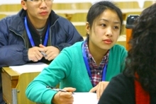 你可不要以為這是在國外某大學,其實這是北京工商大學2010年教師招聘商學院面試組現場的一幕。當面試官見應聘者是位美國名校畢業的博士生時,馬上改用英語提問。應聘者也表現得十分機敏,立刻用純正的美語侃侃而談。一襲淺灰色正裝的她看起來十分干練。