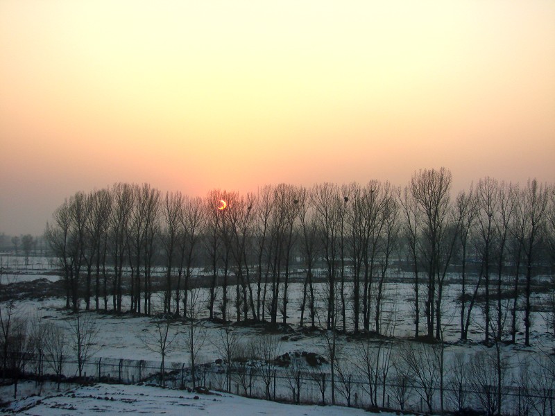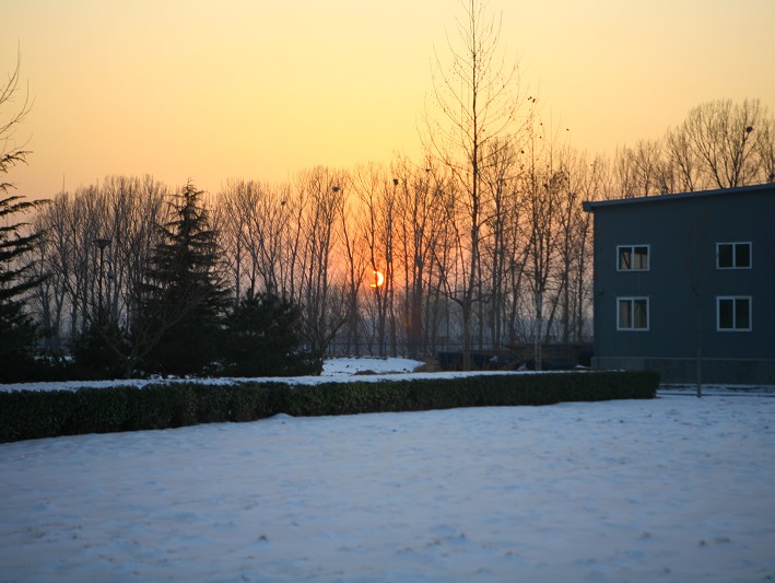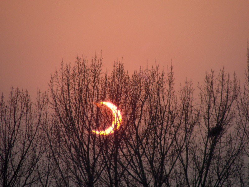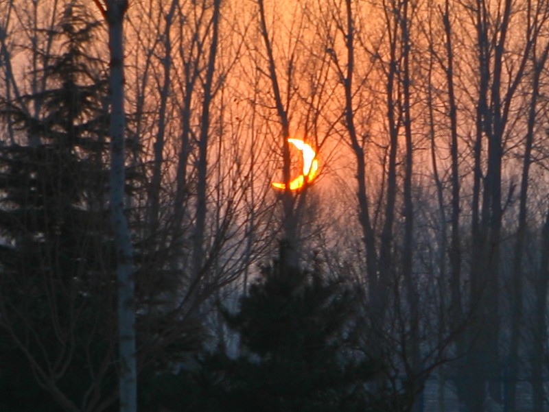 1月15日下午接近17時,良鄉校區出現了美麗的日偏食。此時,正值夕陽西下,落日變成了柔和的粉紅色,掩映在樹林后的日偏食呈月牙狀,宛若一輪粉紅色的新月,十分美麗。這番奇景吸引師生紛紛駐足觀望,不少人掏出手機、相機拍照留念。