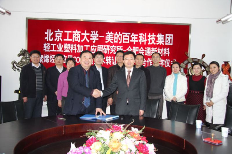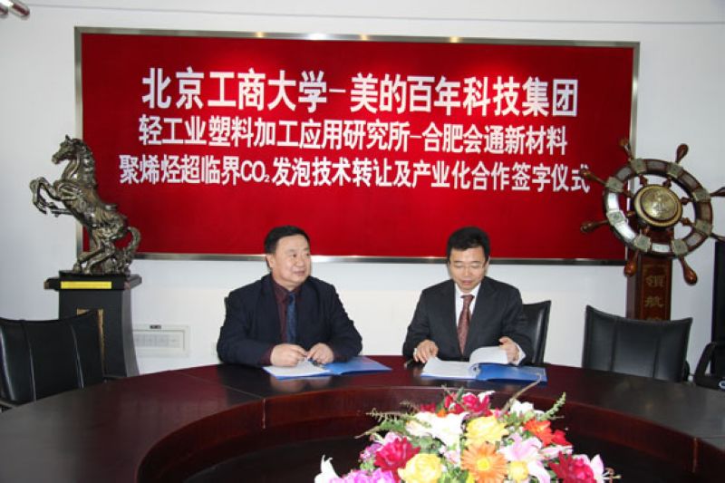 1月28日在材料系(塑料所)學(xué)術(shù)報(bào)告廳舉行了“北京工商大學(xué)——美的百年科技集團(tuán),輕工業(yè)塑料加工應(yīng)用研究所——合肥會通新材料聚烯烴超臨界CO2發(fā)泡技術(shù)轉(zhuǎn)讓及產(chǎn)業(yè)化合作”簽字儀式,百年科技集團(tuán)總裁筱璘先生、合肥會通新材料有限公司總經(jīng)理何順倫先生、科技處處長王國順教授、材料系(塑料所)領(lǐng)導(dǎo)班子全體成員和各科室主任出席了簽字儀式。該項(xiàng)目技術(shù)轉(zhuǎn)讓總金額380萬元,其中的100萬元作為輕工業(yè)塑料加工應(yīng)用研究所的出資,與合肥會通新材料有限公司共同組建項(xiàng)目合作公司,該項(xiàng)目合作公司注冊資本1000萬元,輕工業(yè)塑料加工應(yīng)用研究所將占有10%的股份。