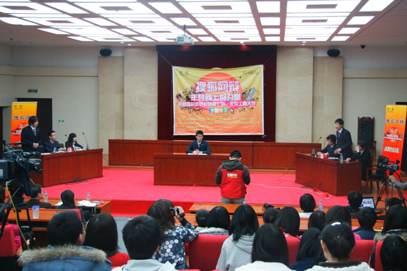 414下午4點,由搜狐社區、我校團委主辦,演講與口才協會承辦的“搜狐網辯走進校園第七站——北京工商大學”活動在我校良鄉校區文科實踐中心模擬法庭舉行。出席此次活動的嘉賓有搜狐公司主管王瑋、我校團委書記呂良、團委老師李明英。此次辯論賽的辯題是:媒體助人辯是非還是弄是非,辯論賽同時在搜狐網站進行網絡現場直播。