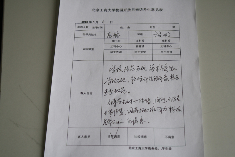 “付出是有回報的”,引導員趙豪杰笑容滿面地翻開一沓沓的《北京工商大學校園開放日來訪考生意見表》對記者說道,“你看,隨便一翻都是‘非常滿意’‘環境優美’‘引導員服務很熱情’,所以,我們做起來是很有激情的,即便是累一點也是很值得的”。