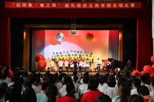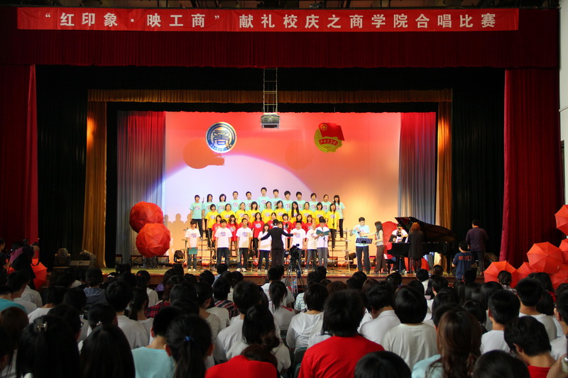 紅傘點綴的舞臺上,一曲激情澎湃的“相親相愛”演繹出了商學院團結奮進的理念,舞臺深處上方懸掛的中國共青團團徽及商學院鮮明的院標熠熠閃耀。商學院黨總支書記龐毅為活動致辭并祝愿本次合唱比賽能夠取得圓滿成功??傊淉嬕氵€以此做聯“一甲子奠基業求變革 播桃李 芳菲源于杏壇;數萬人 弄商潮 追現代 謀和諧 智慧始自商學”代表全體商院學子為工商六十校慶獻禮。
