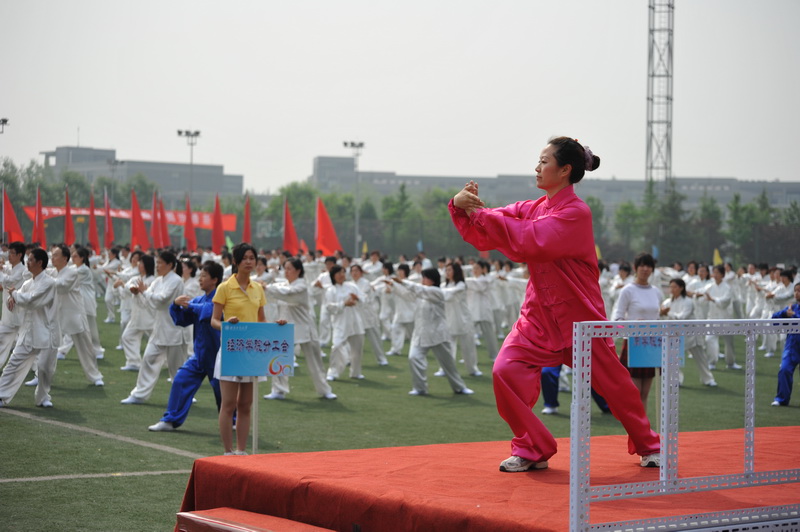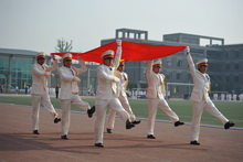 8點整,隨著大會主持人張德玉副書記宣布大會開始,雄壯的音樂聲響起,國旗班的衛士們擎著鮮艷的五星紅旗正步走來。隨后,身穿白色練功服的教職工代表隊邁著自信的步伐走過主席臺,頻頻向觀眾揮手致意,激起一片掌聲。在他們之后,精神抖擻的運動健兒與表演方陣邁著整齊的步伐通過主席臺,并奉獻了一場場精彩的一分鐘演出:商院的武術表演剛柔相濟、法學院的華爾茲優雅迷人,機械學院的旗語表演齊整有力,藝術與傳媒學院的校慶拼圖別出新意,每段表演都精彩萬分。