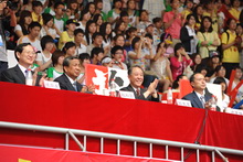 8點40分,在莊嚴的國歌聲中,全體運動員、觀眾肅穆站立,向著徐徐升起的五星紅旗行注目禮。