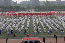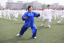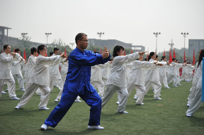 2009年國慶,我校教職工太極拳表演隊(duì)參加北京萬人太極拳表演破吉尼斯紀(jì)錄,這一太極拳傳統(tǒng)被傳承下來,2010年開學(xué)之初,為參加運(yùn)動(dòng)會(huì)的表演,各單位教職工都投入到訓(xùn)練中。大家從最初的“零基礎(chǔ)”到能夠跟隨音樂準(zhǔn)確做動(dòng)作,再到整齊有序,這一過程中,600名老師們利用光盤模仿動(dòng)作要領(lǐng),找專職老師悉心指導(dǎo),大家熱情高漲,訓(xùn)練氣氛十分融洽,效果明顯。