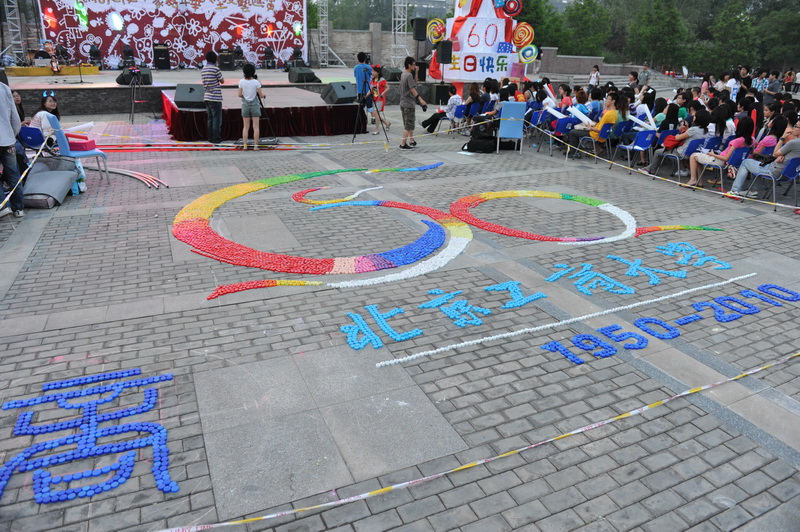 本次第六屆商之夜“印象•嘉年華”大型文藝匯演的舉辦將商學院獻禮校慶系列活動正式推向了高潮。除此之外,商院學子為迎接即將到來的母校六十歲生日還特意制作了兩件額外的禮物,一是在文藝匯演舞臺正前方,用一萬零六十個回收而來的飲料瓶蓋拼繪而成的學校建校60周年標識“騰飛的工商”巨幅圖案,它表達了商院人用一萬顆真心慶賀母校六十歲生日的真摯情感,同時也契合了“綠色校慶”的主題;另一個則是擺放在舞臺右側華美而精致的巨型蛋糕模型雕塑,它寓意著母校輝煌而厚重歷史,以及商院人對母校未來的美好祝福。