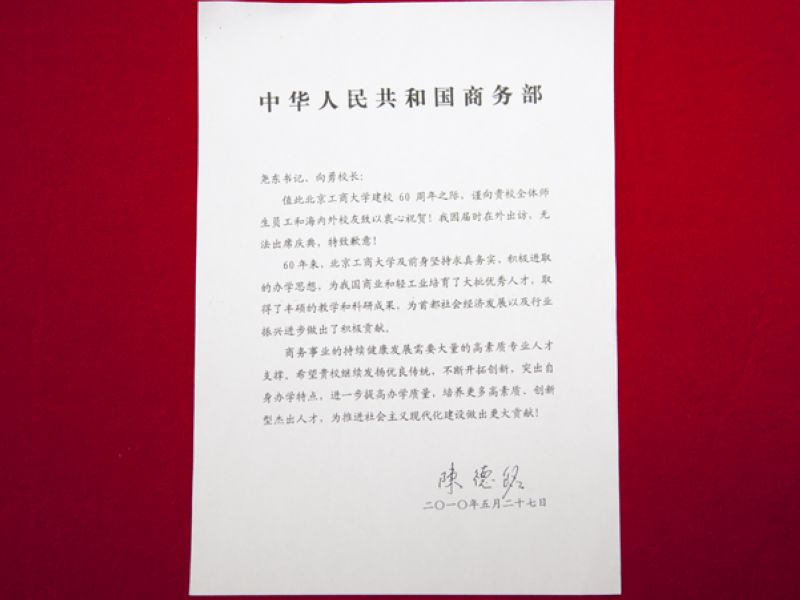 值此北京工商大學(xué)建校60周年之際,謹(jǐn)向貴校全體師生員工和海內(nèi)外校友致以衷心祝賀!我因?qū)脮r(shí)在外出訪,無(wú)法出席慶典,特致歉意!