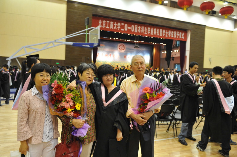 文體館內(nèi),又是幸福的三口之家,我校環(huán)境062的王絲雨,和爸媽擁著一起照相。看著圓滿畢業(yè)的女兒,媽媽感慨萬千,說道:“此時此刻,我想說六個字,首先是感謝,感謝工商大學(xué)及老師對孩子的培養(yǎng),讓我們看到了女兒的成長;其次是希望,希望孩子努力奮斗,成為我們祖國和社會的棟梁;最后是祝福,祝福學(xué)生學(xué)業(yè)有成,祝福工商大學(xué)明天會更好!”
