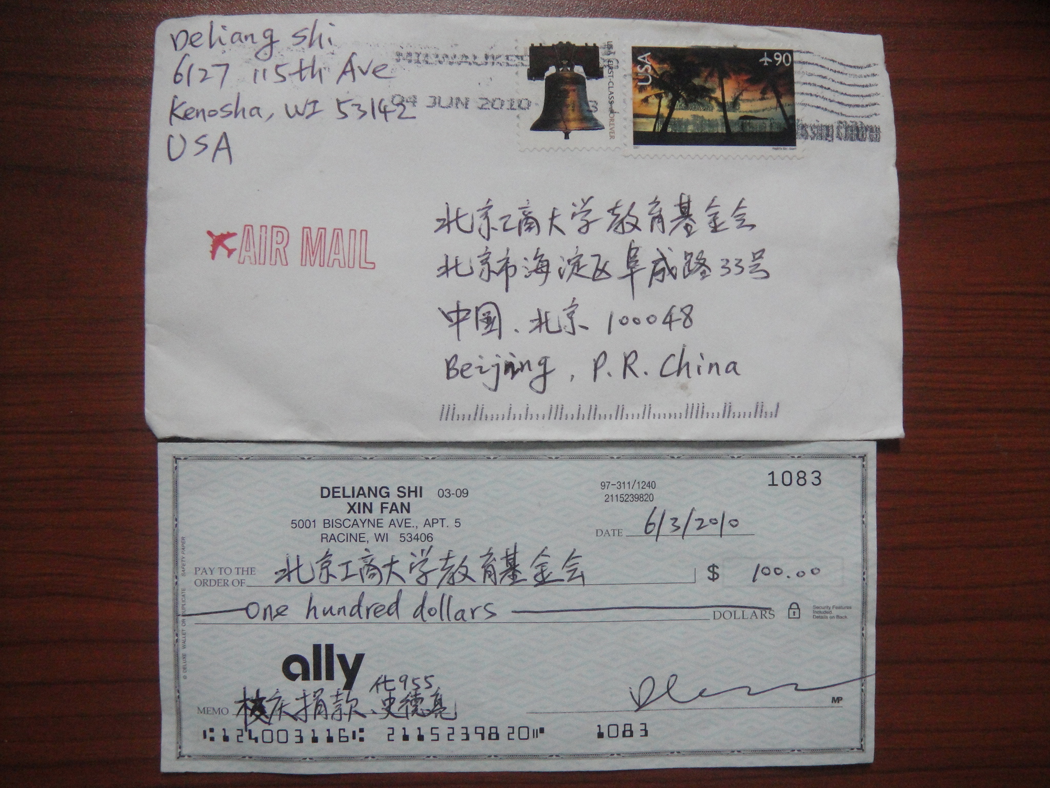 6月29日,學(xué)校教育基金會(huì)收到一封來自美國威斯康辛州的信。這是化955班的史德亮校友從網(wǎng)上得知母校60年校慶后,特寄來賀信和100美元支票。