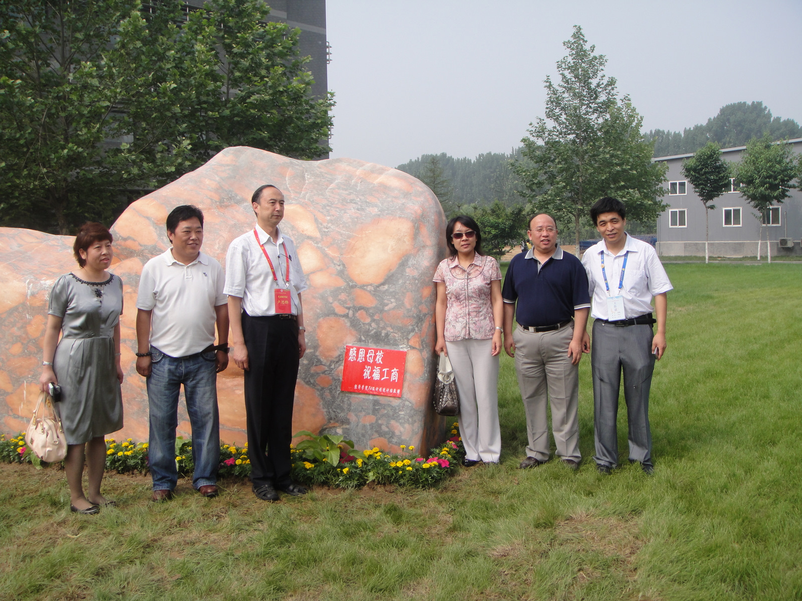 景觀巨石“龍騰工商”長10米,高1.6米,寬0.8米,重66噸,可謂60年校慶學校收到的“最貴重”的禮品。為選好給母校校慶的賀禮,85計劃統(tǒng)計班校友三次到北方最大的石材市場----房山石材交易市場挑選景觀石,在與學校協(xié)商后,從多塊景觀石中選定我國幾大玉種之一的----南陽玉的朝霞紅。