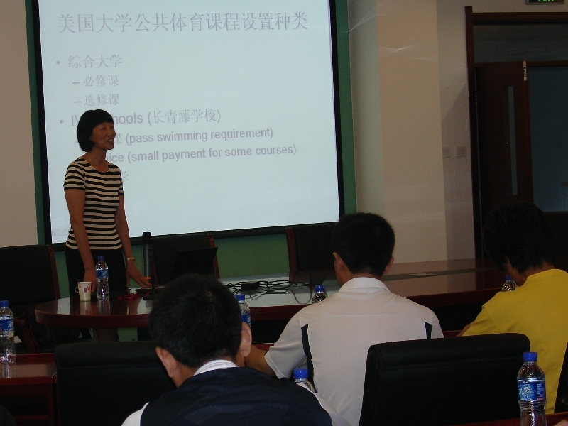 7月8日,應我校體育與藝術教學部邀請,美國南康涅狄克州立大學教授楊進進博士來到我校阜成路校區,為我校體育教師舉辦了題為“美國大學公共體育課程”的主題講座。中國人民大學、北京郵電大學、首都師范大學、北京建筑工程學院、北京聯合大學體育部教師應邀出席,體育與藝術教學部林永和教授及全體體育教師聆聽了講座,體育與藝術教學部主任顧紅主持講座。