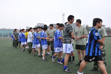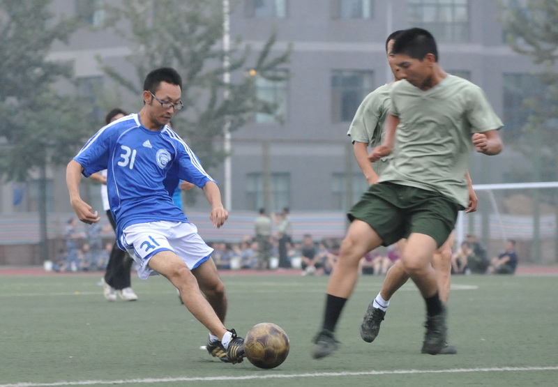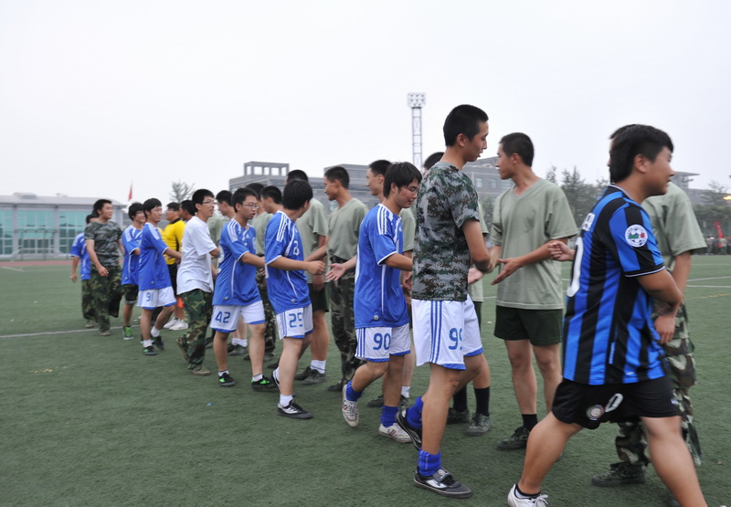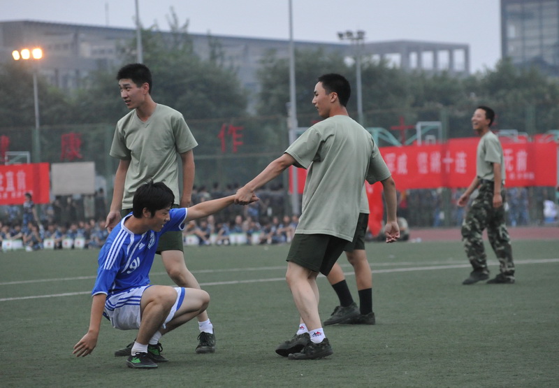 在17日傍晚舉行的教官與軍訓團一二三營的足球友誼賽中,教官們體現出了“班長”的風度,踢得十分小心,氣氛融洽;同學們則是年輕力盛、精力充沛,踢得非常精彩。在第二節(jié)與計信學院的比賽中,當有學生在拼搶中摔倒時,教官們都寧可放棄運球,回過頭來攙扶學生,觀賽同學則以熱烈的掌聲為友誼喝彩。比賽結束,商學院一粒進球,計信學院3粒進球,經濟學院1粒進球,最終,教官0:5負于學生。但教官們的風度卻令全場折服。