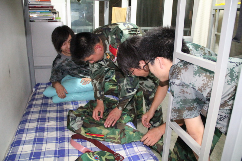 “檢查的來啦!”回聲傳遍了整個樓道。剛才還在嬉笑打鬧的同學們立刻安靜了下來。雖然剛剛結束訓練,但是沒有人躺在床上,同學們有的站著,有的坐在桌子上,還有的夸張點的,躺在桌子上。同學都說“就等這一刻了,別把床單弄皺了!”伴隨著檢查老師的每一聲點評,同學們是有人歡喜有人憂。“宿舍就沒這么干凈過!”很多同學都在檢查后和宿舍合了影。“打掃了一晚上,還真有點軍隊宿舍的意思了!”