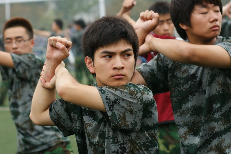 七點半到十點半是隊列訓練——停止間轉法、齊步進行及立定(腿部動作練習)齊步進行及立定、跑步進行及立定。雖然并沒有太大的運動量,但是很多同學的后背還是已經全部濕透了;還有的同學的額前的劉海已經由蓬松的碎發變成了一縷一縷的了。在整整3個小時的訓練當中,并沒有許多休息的時間,但是同學中并沒有人發出抱怨,取而代之的是,“1、2、3、4”的口號聲和打拳的呼號聲。