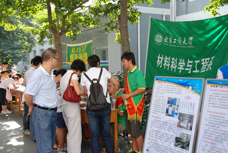 化學與環境工程學院、材料科學與工程系兩大院系在阜成路東校區3號樓下安排了新生報到處。統一的報到臺布置,整齊擺放的宣傳板,隨處可見的態度熱情的服務隊使參與迎新的兩個院系渾然一體,不分你我。從接待處服務人員熱情洋溢的話語、活力細致的安排中可以體會到兩院系為營造豐富多彩、緊張有序的迎新氣氛所做的努力?;W院的迎新負責老師告訴記者,他們精心安排了“志愿者流水線”,即為每個報道的新生都“配送”一個志愿者,幫助他們拎行李、報名、辦手續……直到將新生及家長安安穩穩地送入宿舍才算工作圓滿完成。化工學院還別出心裁地為新生制作了一份“學生指南”手冊,里面涉及到了學院介紹、報道事宜以及關于衣食住行、學長建議等方方面面的內容,記者從這里體會到了何謂服務的至誠至真。