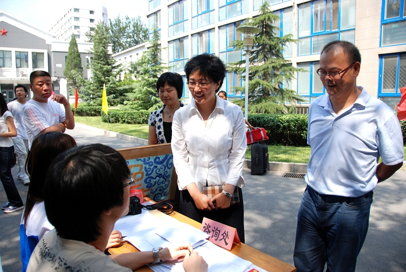 如若記者是新生,踏入校門最先看到的便是著裝統一的志愿者,他們微笑上前,主動提供服務,為那些懷著“陌生感、不安感”的新生及家長留下第一個好印象。在阜成路校區迎新中,校團委和學生會聯合組織派出30余名志愿者,他們“駐守”在校園的各個角落,默默地奉獻著自己的力量。志愿者們有負責新生引導工作的、有在總服務站提供咨詢服務的、有在東區禮堂里維持秩序的、有“安營扎寨”在新生報到處附近進行迎新生宣傳活動的,還有的被安插在“綠色通道”負責資料的整理……志愿者負責人告訴記者,“迎新工作量大,感覺我們還是人數不夠。”