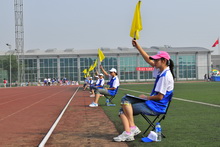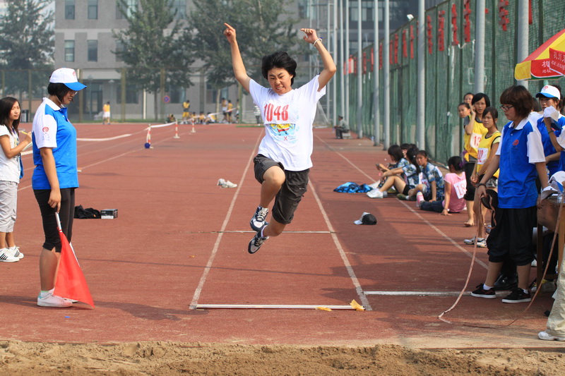 助跑!彎腿!蓄力!起跳!前沖!在男子跳遠預決賽現場,參賽隊員的激情和活力展示著工商學子積極向上的風采。只見一個身著迷彩短袖的男生以百米沖刺的速度助跑,起跳線前騰空一躍,連胳膊上纏繞著的紫色絲帶都跟著跳動起來。騰空的身影,青春的迷彩,紫色的絲帶,連腳下金黃的沙坑都跟著躍動起來。