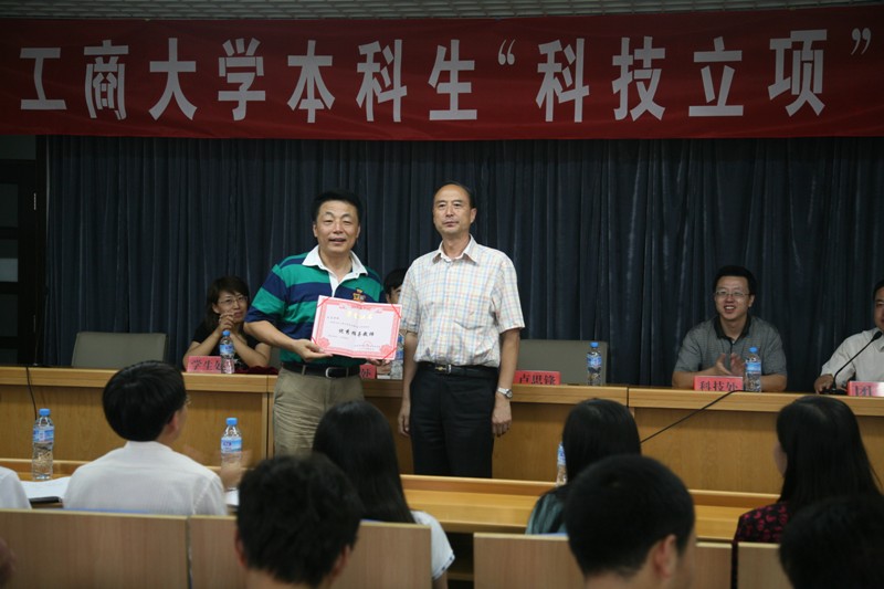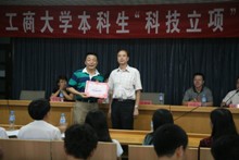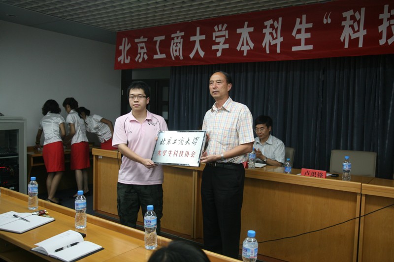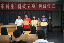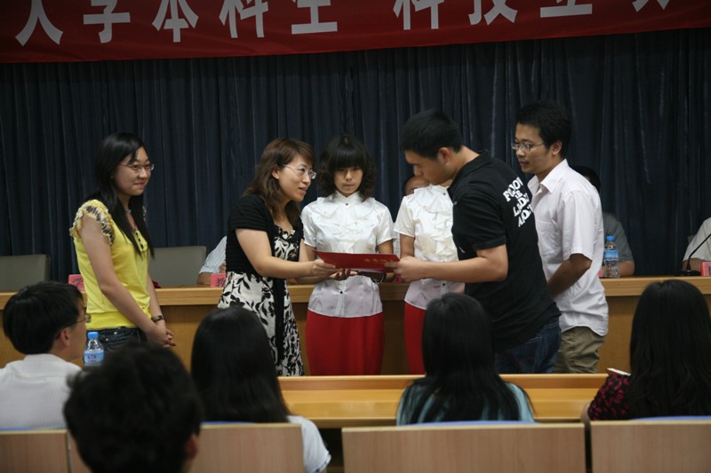 隨后,呂良老師宣讀了2010年“挑戰杯”大學生創業競賽及各項科技學術競賽獲獎同學名單。在2010年“挑戰杯”大學生創業競賽中,我校有一個項目獲得了北京市金獎、三個項目獲得了北京市銀獎、三個項目獲得了北京市銅獎。學校還特別設立了校級的獎勵項目。與會領導和老師分別為獲獎同學頒發證書。曾擔任過多個項目指導的王真教授被評選為優秀指導教師,王真教授在發言中表示,很高興學校能把科學研究從普通的社團活動提升至學校重點工作,而且設立專項基金,他相信這樣的舉措能夠將我校的本科生科學研究工作推向一個新高潮。獲獎同學代表吳溪也發表了獲獎感言。