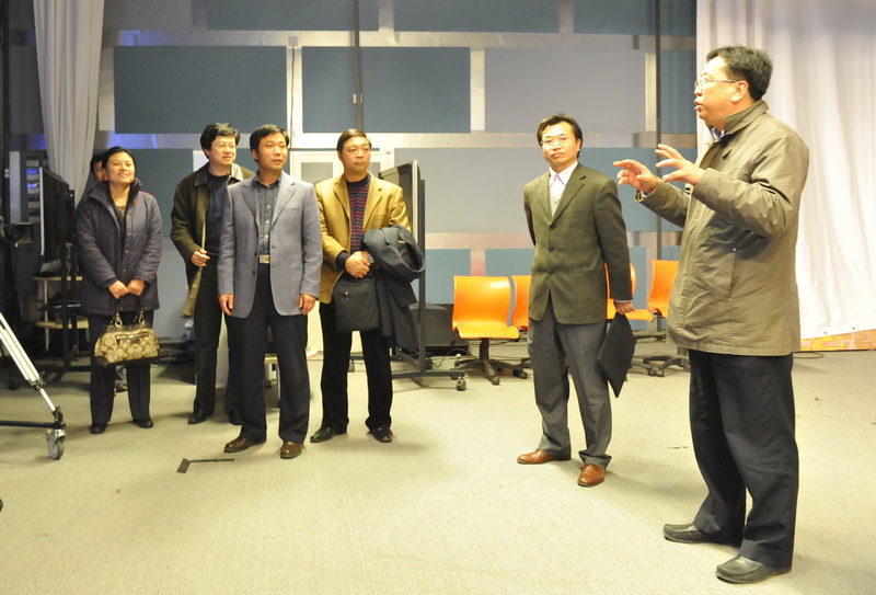 最后,考察團來到了數字藝術制作中心,該中心也是“北京高等學校實驗教學示范中心”。藝術與傳媒學員副院長兼數字藝術制作中心主任張翔向考察團成員介紹了中心的總體情況,并陪同參觀了演播大廳、數字視頻實訓區、數字音頻實訓區等實驗區。
