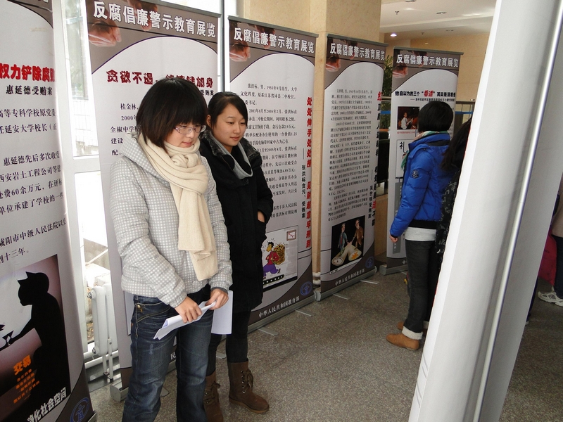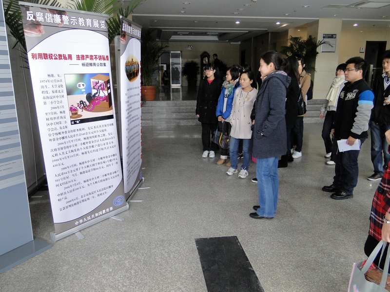 11月11日中午,在阜成路西區(qū)綜合樓一層大廳,研究生部團(tuán)總支組織研究生主要學(xué)生干部30人參觀了反腐倡廉警示教育圖片展覽。此次活動(dòng)是研究生廉潔教育宣傳周活動(dòng)中的一項(xiàng)重要內(nèi)容。