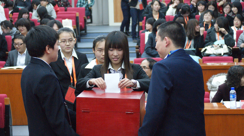 民主選舉,投我一票。在大會(huì)執(zhí)行主席左燁主持通過候選人選舉辦法,總監(jiān)票人李森主持通過監(jiān)票人產(chǎn)生辦法后,激動(dòng)人心的時(shí)刻到來了。由大一、大二同學(xué)民主推薦的二十名候選人,逐一上臺(tái)進(jìn)行競(jìng)選演講。每位候選人簡(jiǎn)要闡述了競(jìng)選崗位的優(yōu)勢(shì)和目的,希望得到代表的支持。但競(jìng)爭(zhēng)是激烈的,在這20位候選人中,只有15位能夠當(dāng)選,并組成外國(guó)語學(xué)院第11屆團(tuán)總支、學(xué)生會(huì)的新領(lǐng)導(dǎo)團(tuán)體。競(jìng)選演講結(jié)束后,代表們開始投票,以選出他們心目中最有實(shí)力的同學(xué)。