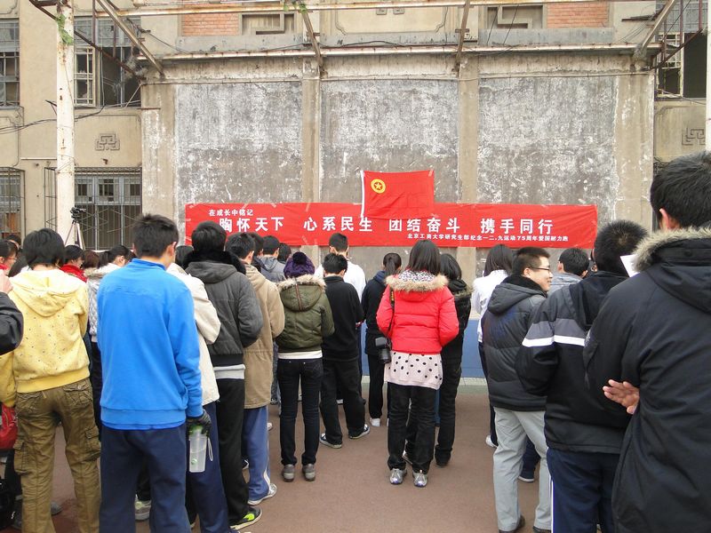 在凜冽的寒風中,在主題橫幅“胸懷天下,心系民生,團結奮斗,攜手同行”和團旗的映襯下,研究生紀念“一二•九”運動愛國耐力跑活動開始。首先許欣老師講話肯定了“一二•九精神”的重要性,表達了對同學們的殷切希望,希望大家繼承和延續(xù)“一二•九精神”,并落實到實際行動中去。隨后,趙煒同學聲情并茂的歷史介紹似乎把大家拉回了75年前,讓在場的同學熱血沸騰,腦海里回蕩起一幅幅畫面。一二•九運動作為中國共產黨領導的一次大規(guī)模學生運動,雖然已經過去了75年,但其精神被不斷傳承和發(fā)揚。對入團誓詞的重溫和《歌唱祖國》的響起,心頭泛起愛國熱情的同時也再次激起了我們青春的激情與活力。隨后廣大同學紛紛上臺簽名,表達了“承繼精神在成長中銘記”的決心。