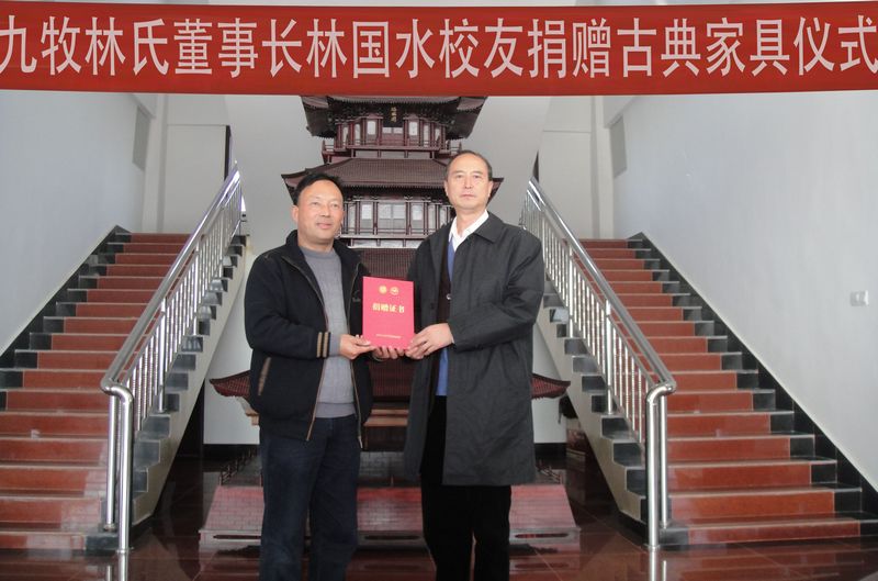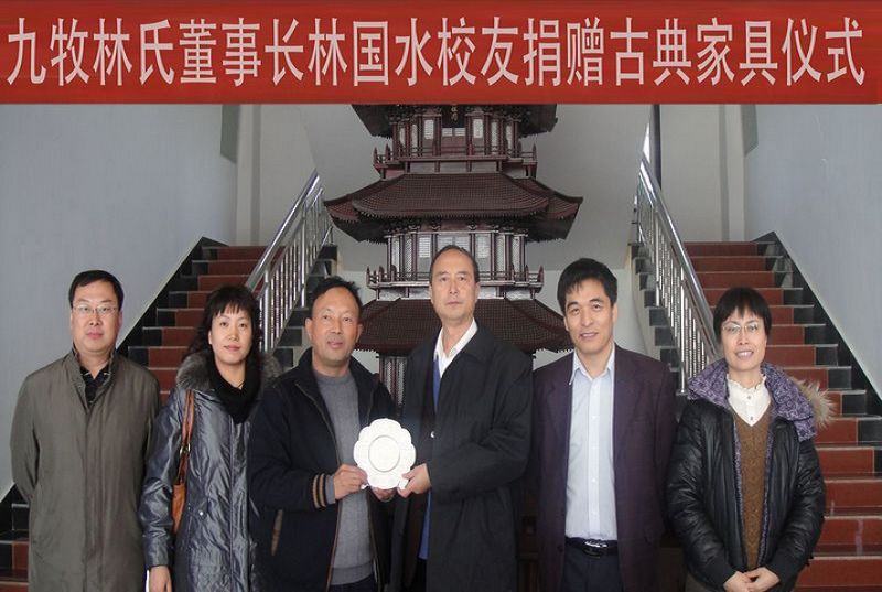 近日,九牧林氏古典家具有限公司董事長林國水校友捐贈的紅木家具送到學校。校黨委副書記、學校校友會常務副會長、教育基金會理事長盧思鋒出席捐贈儀式。校辦主任吉濤,國資處處長王曉華,校友會和教育基金會秘書長張曉磊、副秘書長王嘉彥參加儀式。
