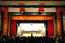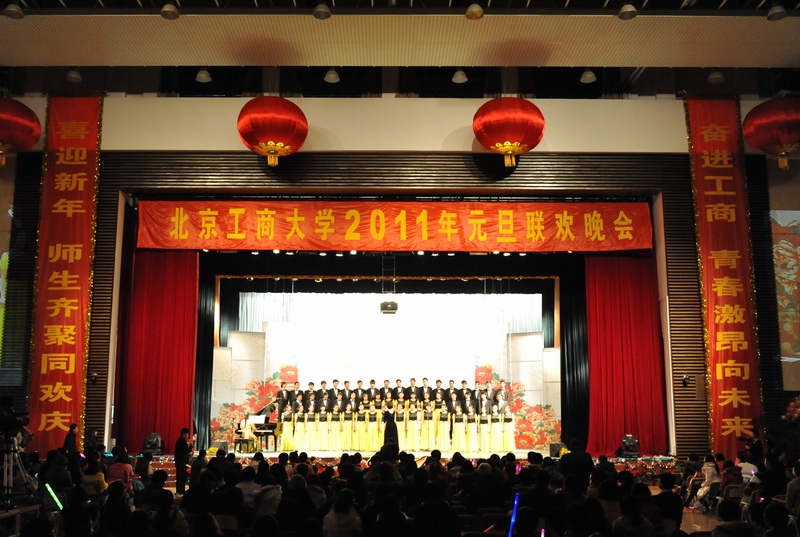 良鄉(xiāng)校區(qū)文體館內(nèi),裝飾一新的舞臺(tái)上掛著四個(gè)大紅燈籠,兩側(cè)分別懸掛著“喜迎新年,師生齊聚同歡慶”和“奮進(jìn)工商,青春激昂向未來”的對(duì)聯(lián)。五彩繽紛的氣球?qū)?huì)場(chǎng)點(diǎn)綴得絢麗多彩,整個(gè)會(huì)場(chǎng)洋溢著歡樂的氣氛。 12月31日晚,2010年元旦聯(lián)歡晚會(huì)掀開了神秘的面紗,我校師生齊聚一堂,歡慶元旦佳節(jié)。