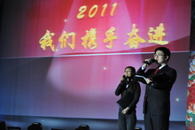 除了有熱情洋溢的管樂演奏、異域風(fēng)情的舞蹈、動(dòng)聽優(yōu)美的歌曲……此次晚會(huì)還將“春晚”提前搬到了舞臺(tái)上。外請(qǐng)嘉賓賈鈴、白凱南將在今年春晚上演《大話捧逗》,而今晚他們特意為我校量身打造了相聲《大駕光臨》。風(fēng)趣幽默的臺(tái)詞,夸張搞笑的動(dòng)作,引來臺(tái)下的一片笑聲。
