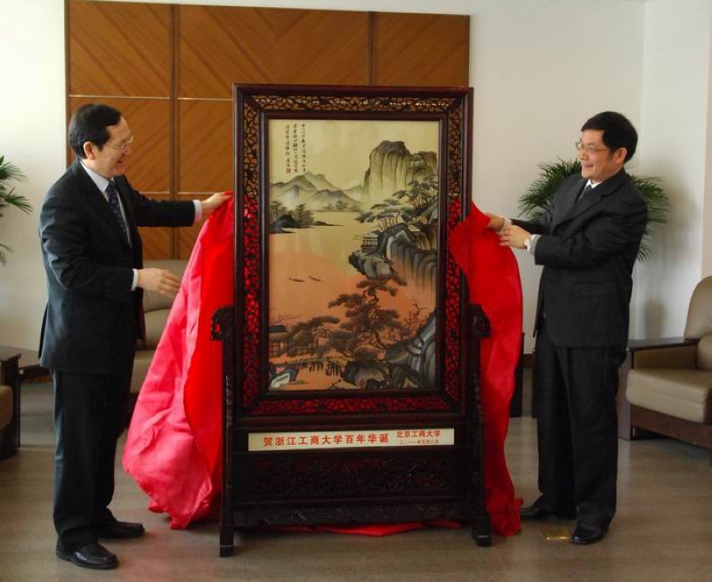 2011年適逢浙江工商大學建校100周年,譚校長代表北京工商大學全校師生員工向浙江工商大學百年校慶捐贈屏風一樽,并預祝百年校慶各項活動圓滿成功。佇立錢塘江畔,耳邊潮水湯湯,兩校領導同勉要繼承兄弟高校情誼,在實施科教興國和人才強國戰(zhàn)略中,勇立改革創(chuàng)新、特色名校、加快轉(zhuǎn)型、科學發(fā)展的歷史潮頭。
