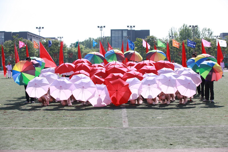 伴隨著英文、法文歌曲的背景音樂,外語學院的學生撐著紅色、粉色、花色三種色彩的雨傘出現。他們身著粉色連衣裙、紫色襯衫,盡情展示著外國語學院的靚麗青春;他們用外語人活力而翩躚的舞姿征服全場,給高溫的賽場帶來別樣的動人風情!