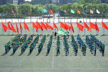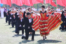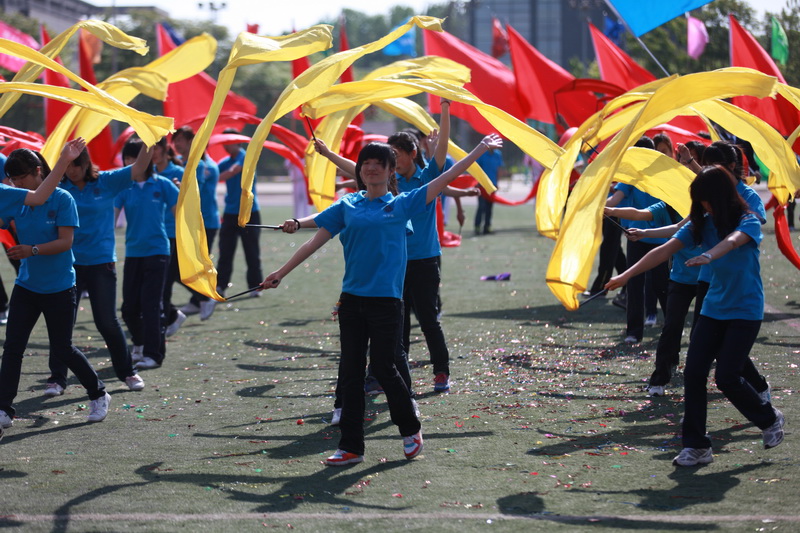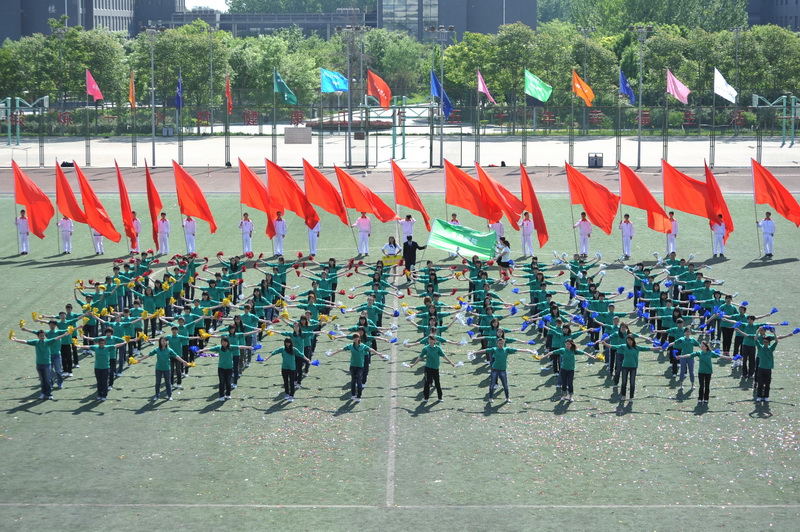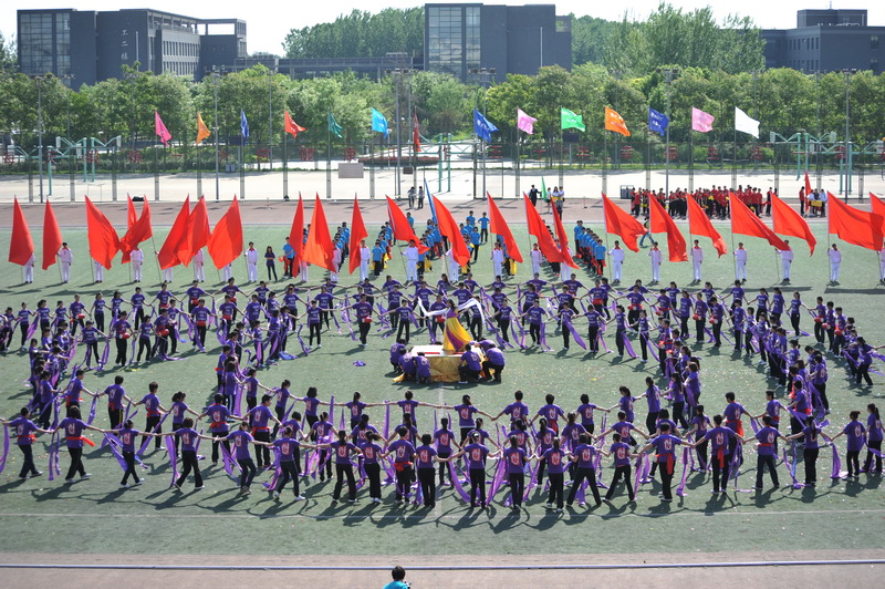 理學(xué)院的男女生們穿著藍(lán)色的衣服,分別手持紅色、黃色綢帶,在操場(chǎng)中央動(dòng)感起舞。作為一個(gè)新成立的學(xué)院,他們擺出了“合”字陣型,這體現(xiàn)了全體師生齊心合力,團(tuán)結(jié)奮進(jìn)的堅(jiān)定信念。